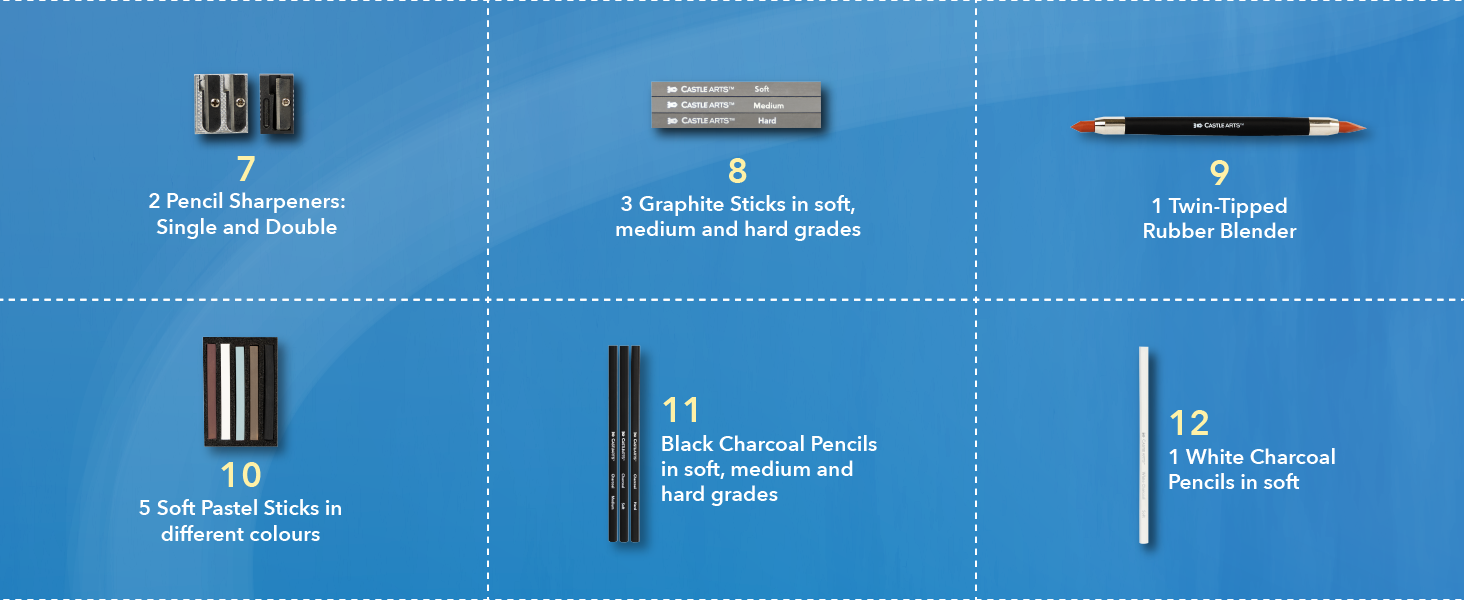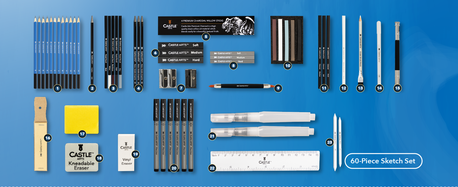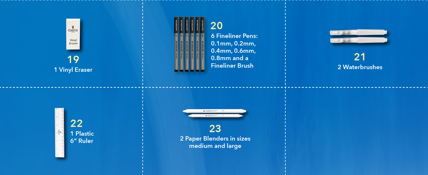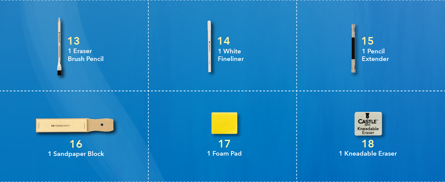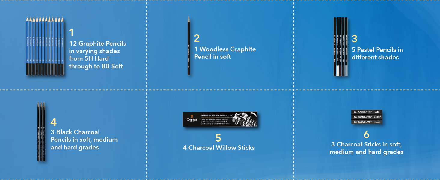 POTENCIA DE FUEGO FORMIDABLE  Comisariada por artistas internos para dibujantes, experimentados y principiantes: lápices de grafito + varillas, lápices de carboncillo + varillas, lápices pastel + varillas, lápices solubles en agua + pinceles de agua, rotuladores de punta fina, además de licuadoras, borradores y herramientas.
