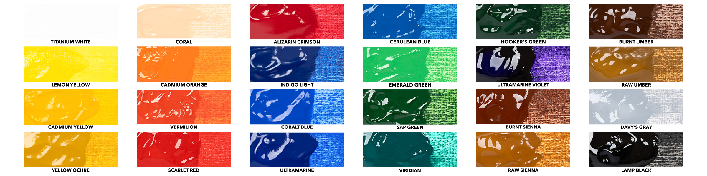 24 tubes de 12 ml : Jaune citron, Jaune cadmium, Ocre jaune, Corail, Orange cadmium, Vermillon, Rouge écarlate, Alizarine cramoisie, Indigo clair, bleu cobalt, outremer, bleu céruléen, vert émeraude, vert sève, vert émeraude, vert Hooker, violet outremer, terre de Sienne brûlée, terre de Sienne naturelle, terre d'ombre brûlée, terre d'ombre naturelle, gris Davy, noir de lampe et blanc de titane.