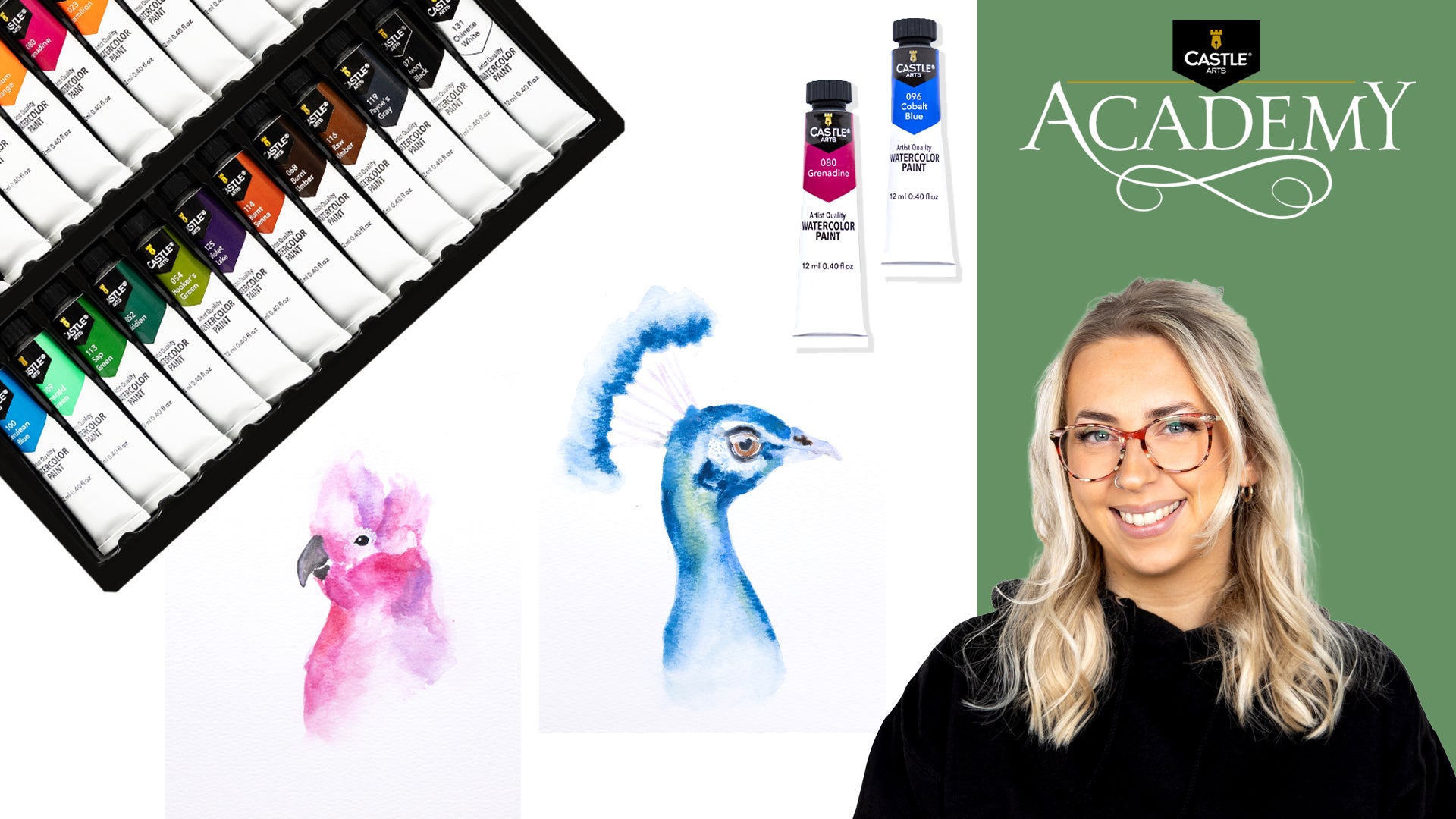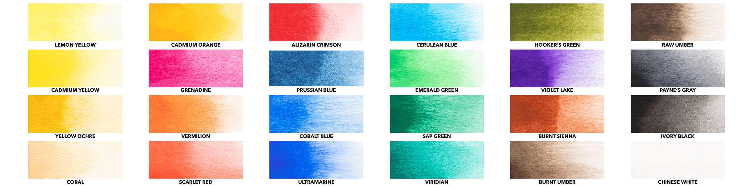 24 tubes de 12 ml : Jaune citron, Jaune cadmium, Terre cuite claire, ocre jaune foncé, corail, vermillon, alizarine cramoisie, rose, laque pourpre, bleu de Prusse, outremer, bleu cobalt, vert sarcelle, Vert émeraude, Phthalo vert, Vert Château, Vert de Prusse, Violet Français, Terre de Sienne Brûlée, Terre d'Ombre Brûlée, Brun Van Dyck, Gris Anthracite, Noir de Lampe et CBlanc chinois.