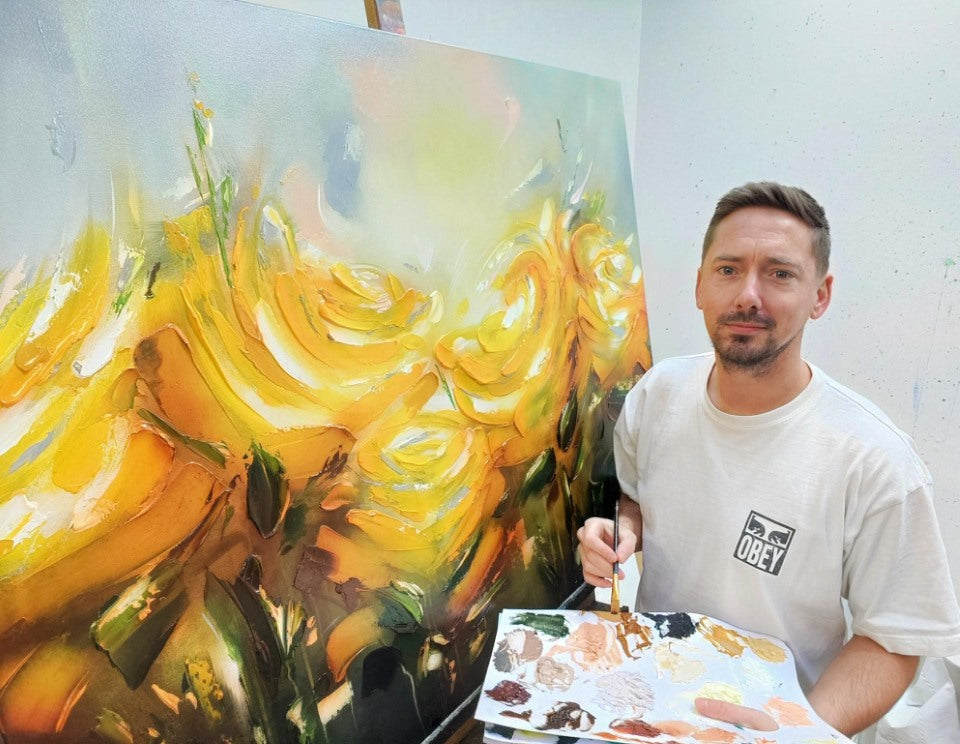 Comencé pintando arte abstracto, luego pasé a paisajes y, más recientemente, a pinturas florales. Con el tiempo, desarrollé mi propio estilo, usando colores llamativos y texturas pesadas para crear profundidad y movimiento. Me encanta trabajar tanto con acrílicos como con óleos: acrílicos por su velocidad y óleos por su vitalidad y textura mantecosa.